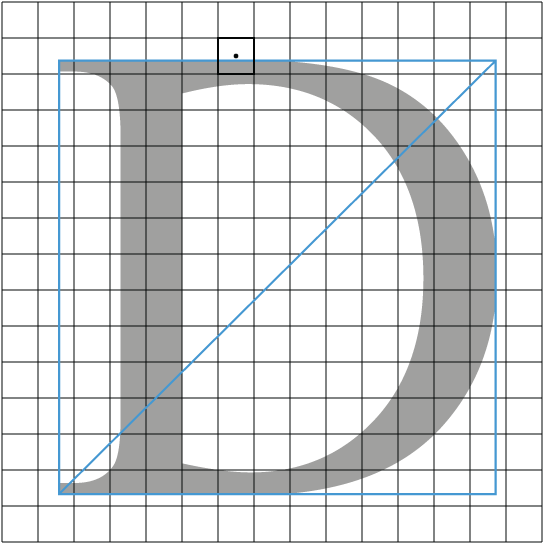 Each square represents a single pixel, and the blue lines correspond to the exact bounding box for the capital D after it has been divided into two triangles. When a triangle is rasterized by the GPU, only pixels whose centers fall inside the triangle are included. This causes a problem for pixels on the boundary of a glyph such as the one whose center point is shown at the top of the diagram. Since the center of this pixel is not inside the glyph’s bounding box, the pixel is not rendered even though a large portion of it is covered by the interior of the glyph. Ignoring this problem leads to very poor quality on the edges of the glyph, and it gets worse as the font size decreases. The correct thing to do for proper antialiasing and high-quality rendering is to fill that pixel with a value proportional to the actual coverage. But how do we get the GPU to render these pixels?